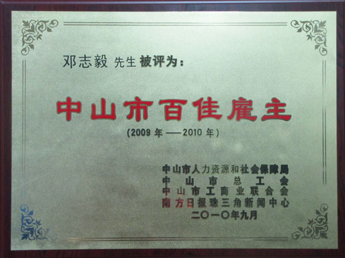 2010年9月13日下午2:00,中山市2010年度百佳雇主頒獎典禮暨“同是中山建設者”百佳流動務工人員評選活動啟動儀式在市文化藝術中心大劇場舉行。伴隨著現(xiàn)場近千名觀眾的熱烈掌聲,由中山市人力資源和社會保障局、中山市總工會、中山市工商聯(lián)以及南方日報珠三角新聞中心共同舉辦的“中山市首屆百佳雇主”評選結果正式揭曉,我司在眾多申報企業(yè)中脫穎而出,獲“中山市首屆百佳雇主”殊榮。