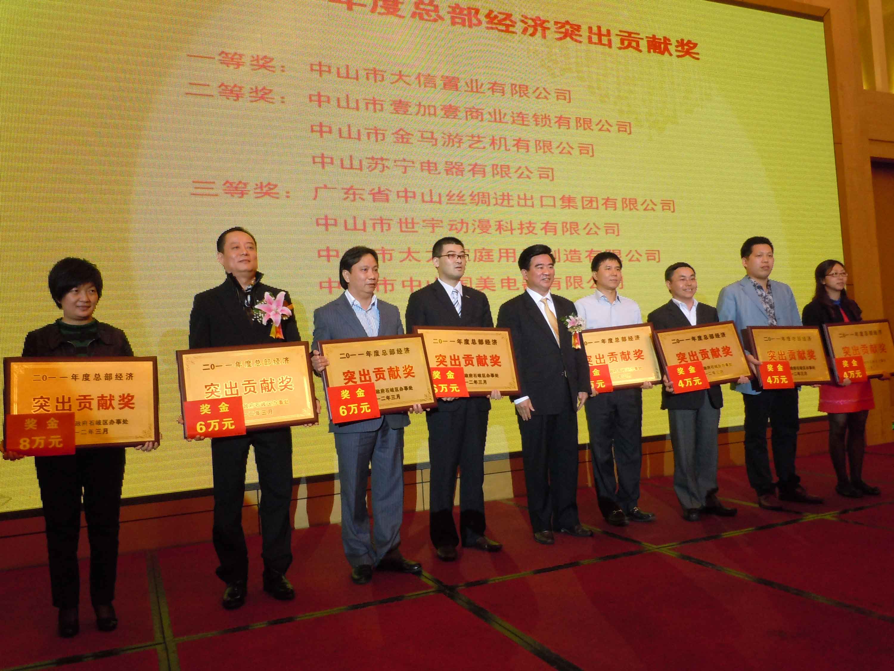 晚會上,石岐區(qū)辦事處為全區(qū)經(jīng)濟發(fā)展作出突出貢獻的42家企業(yè)及協(xié)會共計54個項目進行了通報表彰。在過去一年里,我司著力推進產(chǎn)業(yè)轉(zhuǎn)型升級,向高科技4D動漫影視娛樂項目延伸,以科技創(chuàng)新帶動發(fā)展,為區(qū)內(nèi)經(jīng)濟騰飛作出了突出貢獻,受到了區(qū)辦事處的肯定與嘉許,榮獲“二〇一一年度總部經(jīng)濟突出貢獻獎”、“二〇一一年度企業(yè)自主創(chuàng)新及科學技術獎”、“二〇一一年度企業(yè)黨建促發(fā)展先進獎”等三大獎項,共獲得了石岐區(qū)10萬元的獎金獎勵。鄧志毅董事長、曾慶遠副總經(jīng)理及楊焯彬書記分別代表公司上臺領獎。