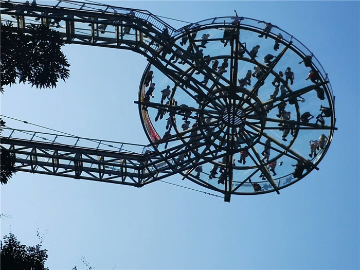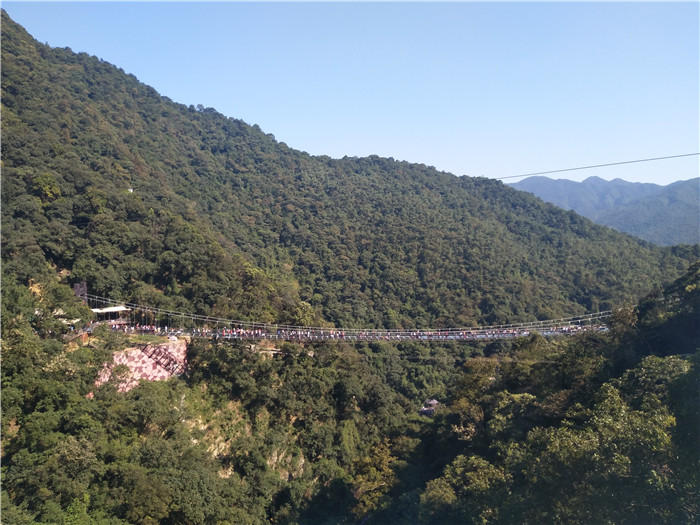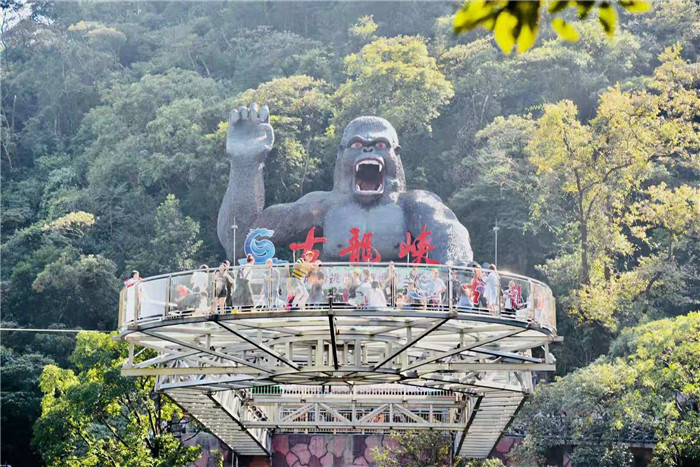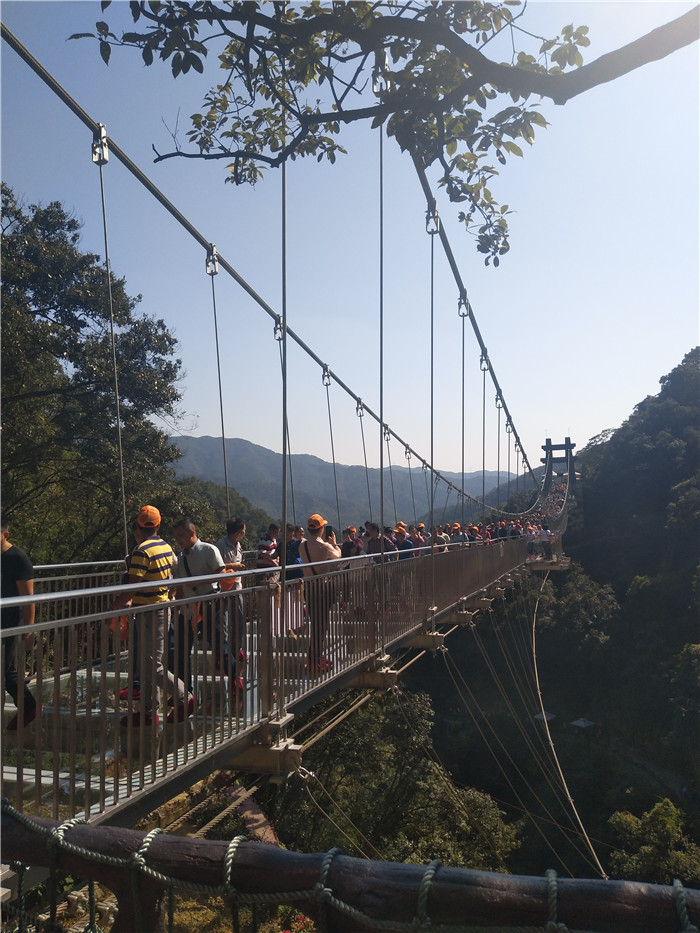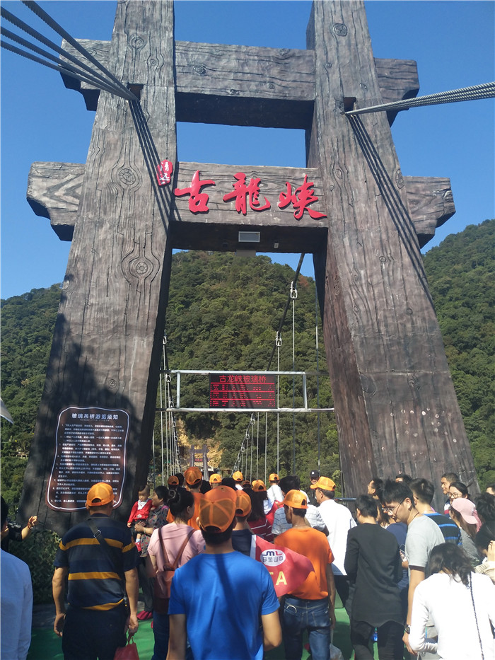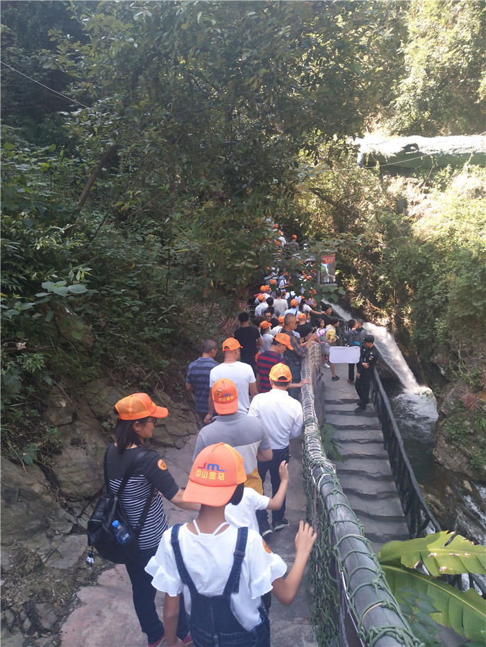 抵達目的地1——清遠古龍峽云天波霸。這個以獲得四項世界紀錄著稱的景區(qū)景區(qū),逢周末閑日和天公作美,此刻更是人山人海,縱使如此,500多名金馬人們?nèi)允浅尸F(xiàn)出了良好的團體素質(zhì)和修養(yǎng),文明就餐、有序排隊、耐心等候......景區(qū)內(nèi)仿佛形成了一道新的橙色人文風景線。隨后,沿途爬山、觀光、賞瀑、自拍、擺拍、合影......歡笑和驚呼連綿不斷。走上最大規(guī)模的高空觀光玻璃組合云天波霸,驚險和刺激正式登場:世界最長最寬的329米觀瀑玻璃橋、UFO造型的懸空玻璃平臺、“守護神”巨型猩猩雕塑,漫步其中,猶如閑庭散步;俯視下方,卻又步步驚心!