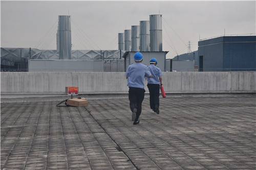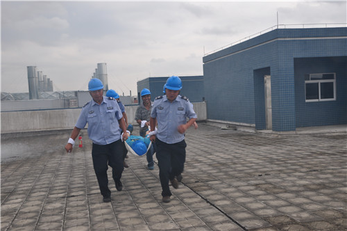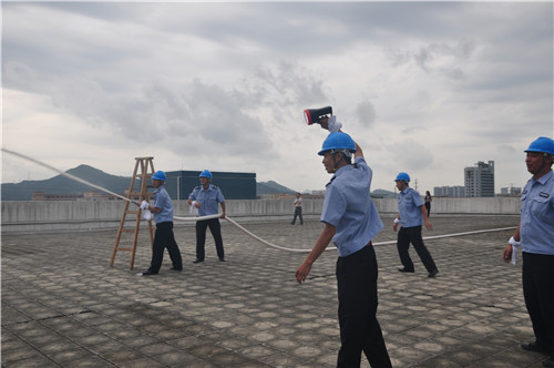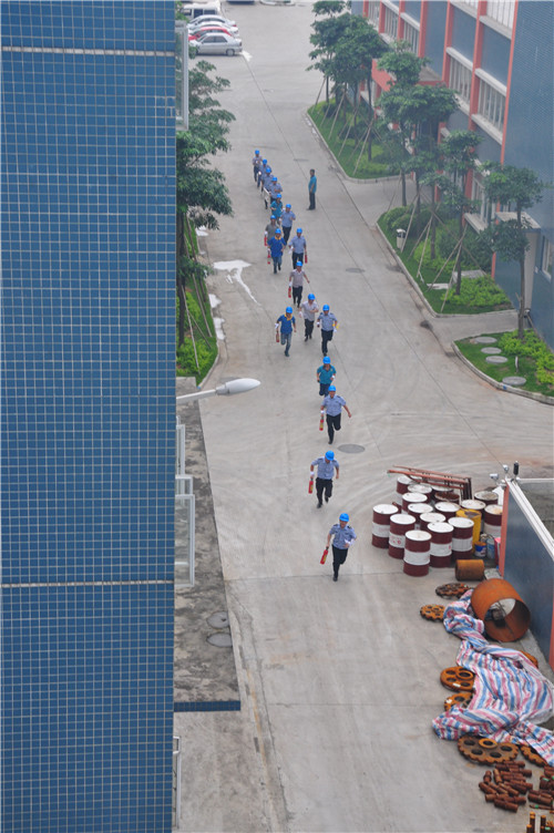 本次演練以消防重點車間的頂層出現(xiàn)火災警情為模擬場景,于計劃當日下午15:45進行。在正式開始前,金馬義務消防隊在公司大門集結,配備相關設備整齊列隊,等待總指揮下達啟動命令。時間一到,由生產(chǎn)中心高總、人力資源中心容部長示意行動開始,保安隊長接受命令,并向待命的消防隊傳達立即到處滅火的指示。接到消息,金馬義務保安隊火速奔赴火警現(xiàn)場——距離出發(fā)點300多米的車間4樓頂層。僅用時2:37,撲火組已到達現(xiàn)場,根據(jù)燃燒物特性,用滅火器迅速進行第一輪滅火。待火勢稍減,他們快速移開燃燒物,阻擾火勢蔓延,并打開消防喉進行撲救。與此同時,救護組也已到達現(xiàn)場,展開擔架轉(zhuǎn)移傷員,到達安全場所進行搶進。不久,火勢撲滅,在各消防小組的密切配合下,本次消防演練勝利結束。