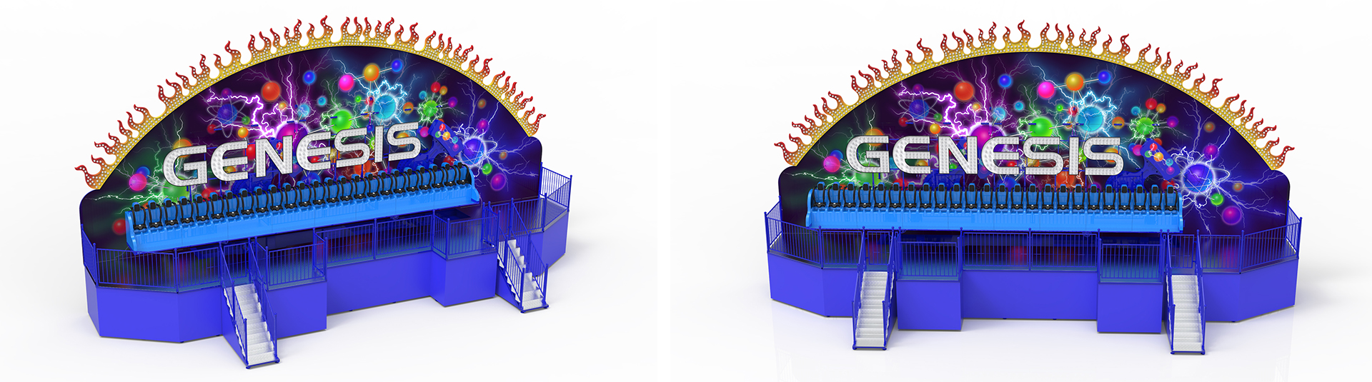 擺臂支撐座艙圓形運動,也可以實現(xiàn)正反兩種通過最高點的運動;占地面積小,外觀造型新穎;