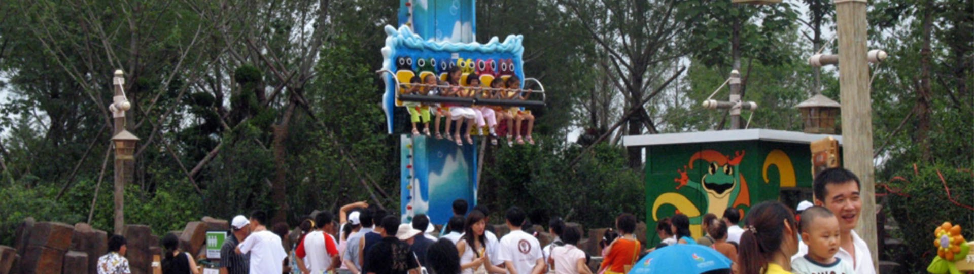 青蛙造型逼真的座艙伴隨著蛙鳴叫聲的背景音樂,沿著垂直軌道上下往復(fù)連貫跳躍運(yùn)動(dòng),幅度有大有小,令游客感受空間飛行跳躍的樂趣。