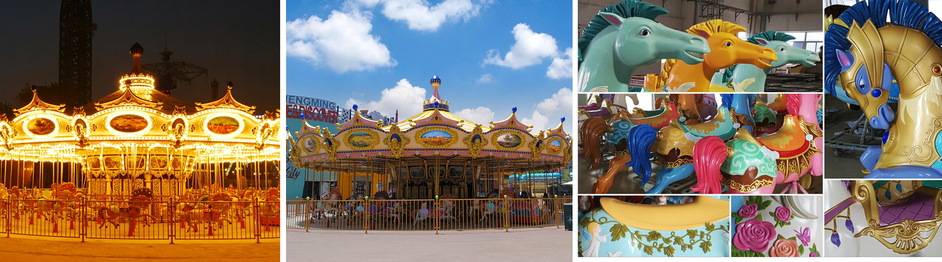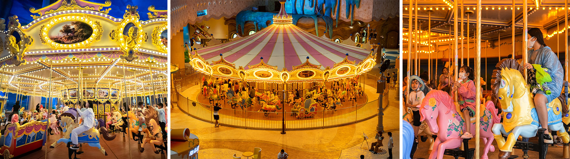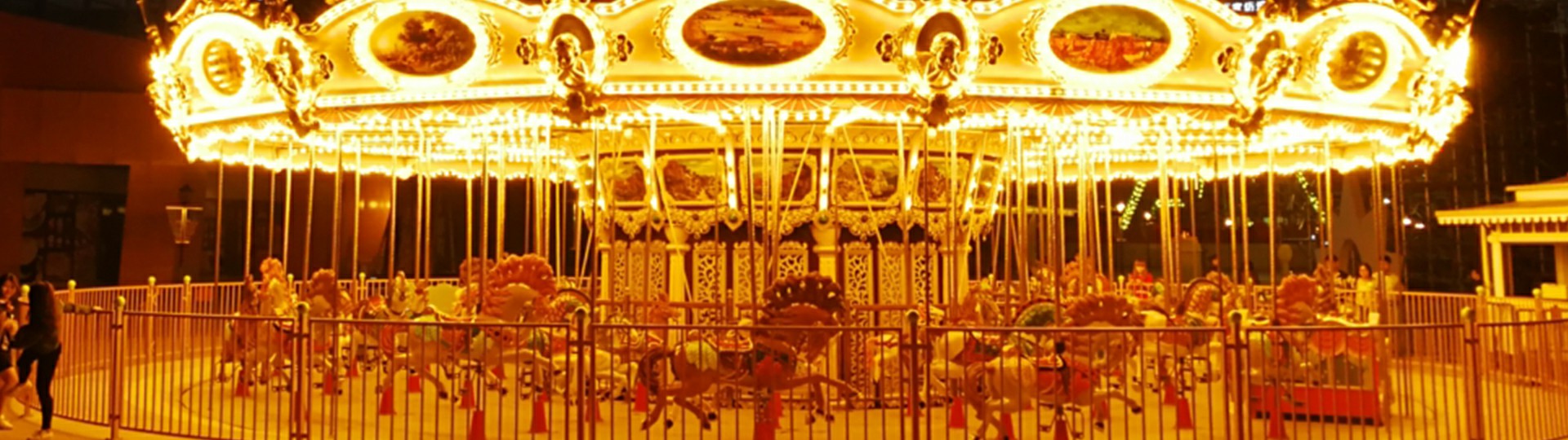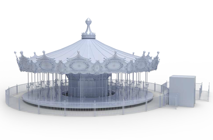 豪華轉(zhuǎn)馬采用歐洲皇家的古典豪華的裝飾風格,頂棚華麗,內(nèi)外圍板鑲嵌著彩色浮雕和絢爛彩燈,馬匹及宮庭式馬車結(jié)合多彩的花飾,造型精致夢幻。