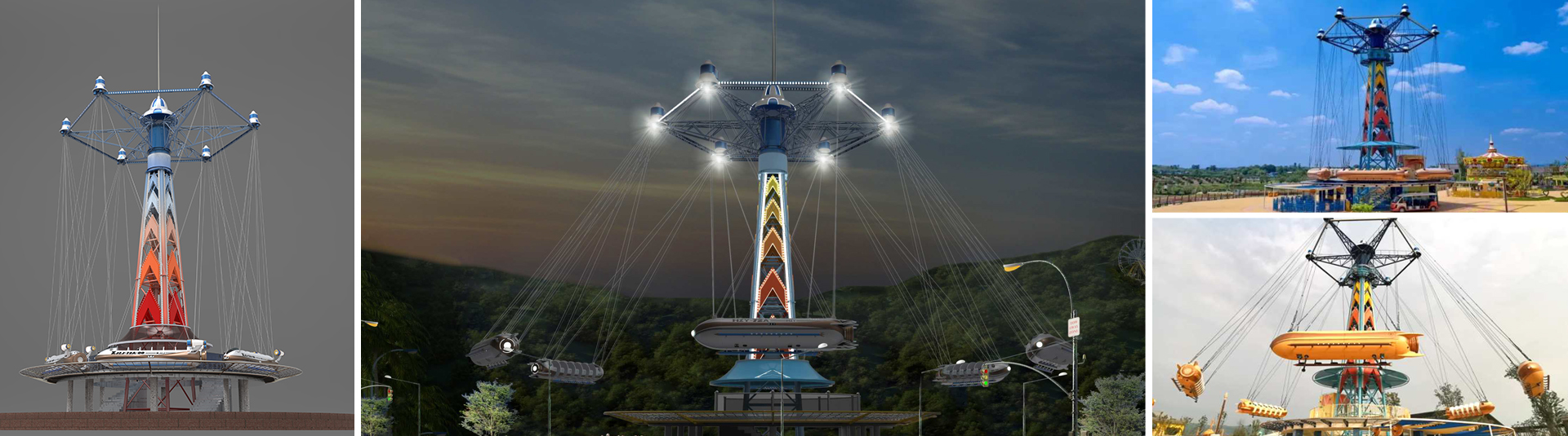 幻速追影六個(gè)飛機(jī)吊掛座艙隨同旋轉(zhuǎn)架相對(duì)塔體自由旋轉(zhuǎn)并外擺升起,繞中心立柱飛行,科幻又刺激。夜間智能燈光系統(tǒng)亮起,成為樂園一道的奇趣風(fēng)景線。