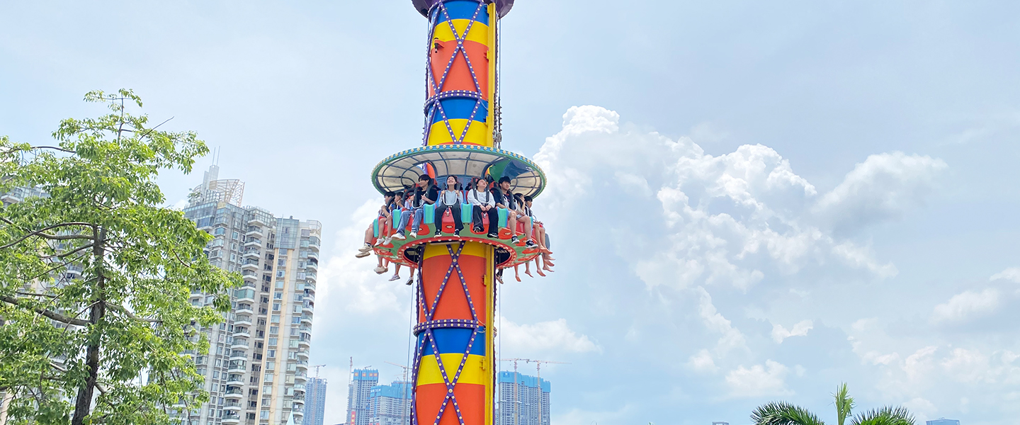 旋轉(zhuǎn)太空梭集傳統(tǒng)跳樓機(jī)豎直升降運(yùn)動(dòng)和旋轉(zhuǎn)運(yùn)動(dòng)于一身,運(yùn)動(dòng)方式多樣新穎,其簡形塔架可繞其自身下端轉(zhuǎn)動(dòng),滑行架跟隨塔架旋轉(zhuǎn)的同時(shí)支撐座椅沿塔架豎直軌道做升降運(yùn)動(dòng)。