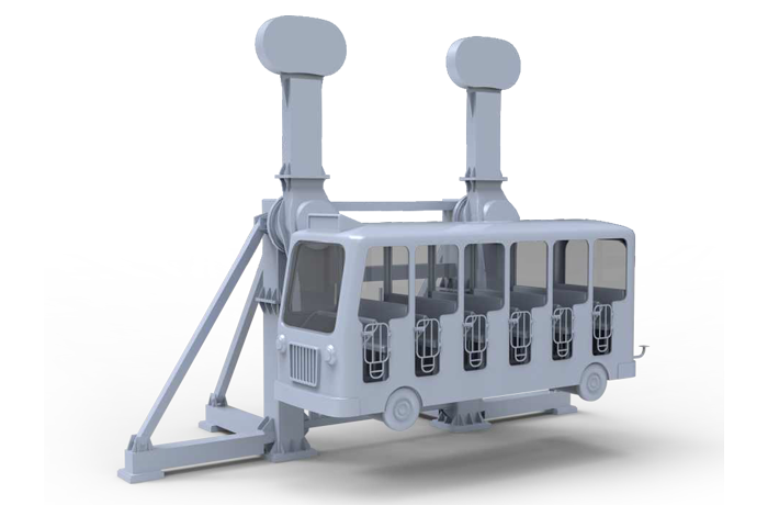 瘋狂巴士配備雙向可逆無(wú)級(jí)自動(dòng)調(diào)速系統(tǒng),經(jīng)過(guò)減速、分速等一系列機(jī)構(gòu),實(shí)現(xiàn)一臺(tái)電機(jī)帶動(dòng)兩個(gè)驅(qū)動(dòng)臂的擺動(dòng),帶動(dòng)巴士的平動(dòng),巴士在電氣系統(tǒng)的控制下可以實(shí)現(xiàn)正反兩種通過(guò)最高點(diǎn)的運(yùn)動(dòng),給乘客以歡樂(lè)搖擺的體驗(yàn)。