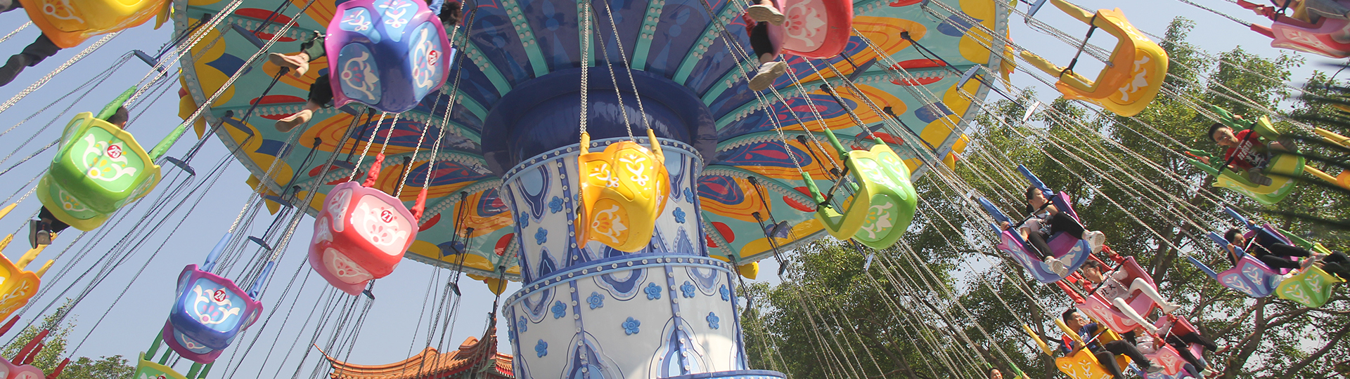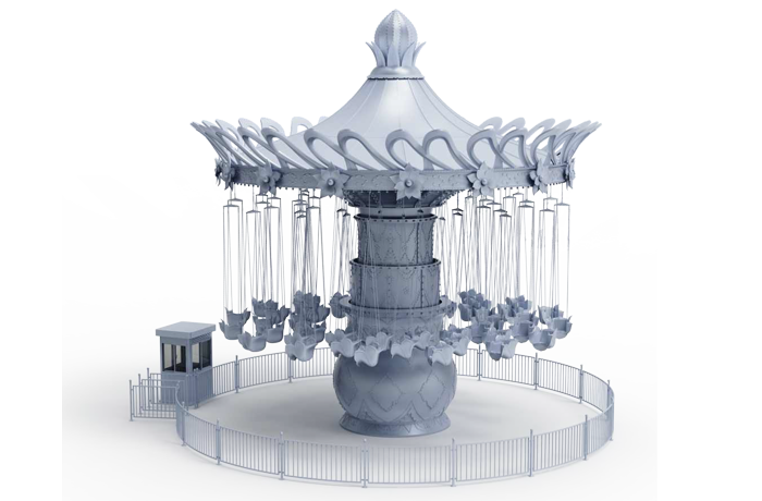 颶風(fēng)飛椅設(shè)備通過傘形轉(zhuǎn)盤的旋轉(zhuǎn)和中間轉(zhuǎn)臺的錯位旋轉(zhuǎn),實現(xiàn)飛椅的波浪式運動,乘客猶如在空中自由飛翔飄蕩。