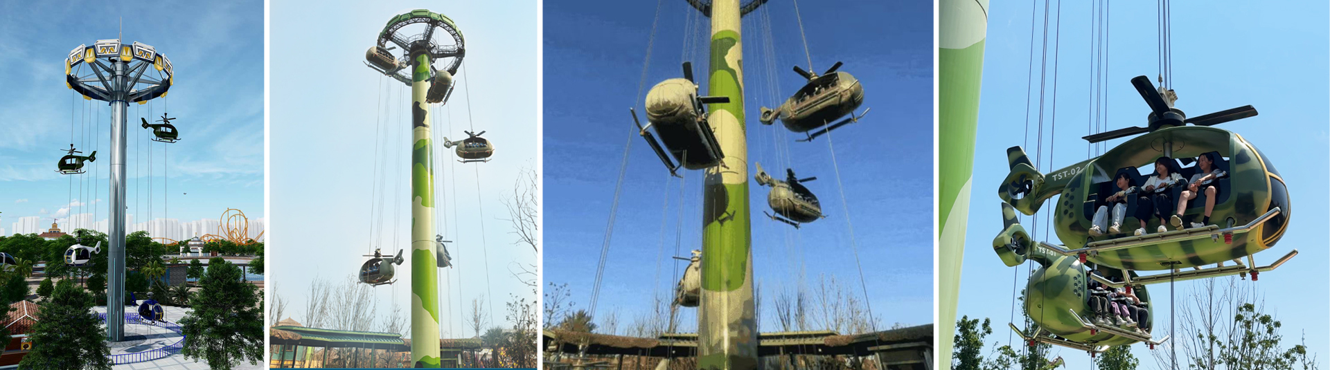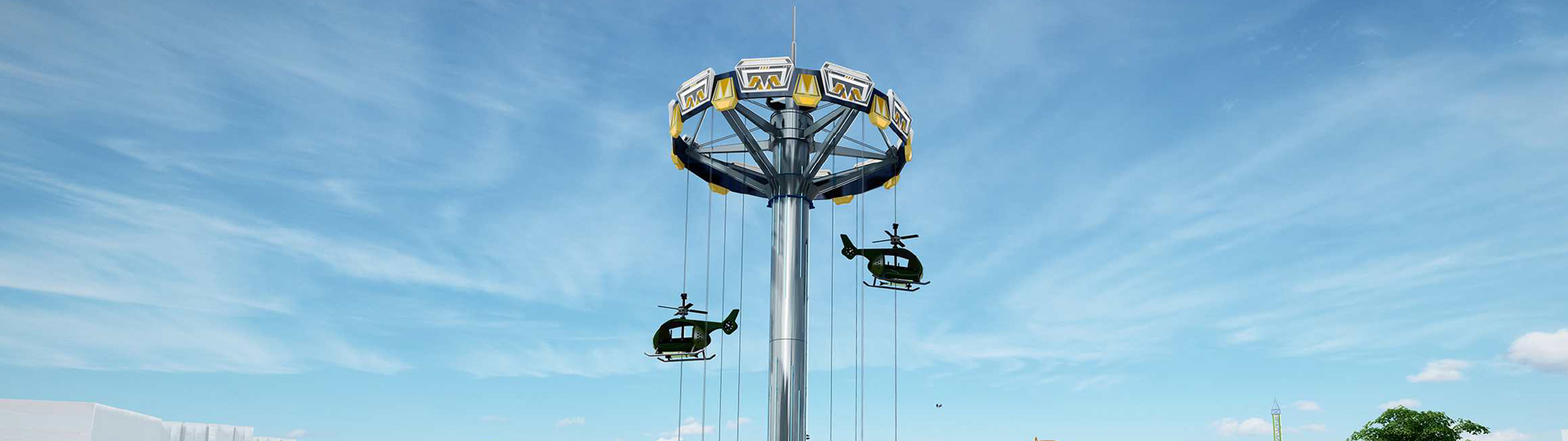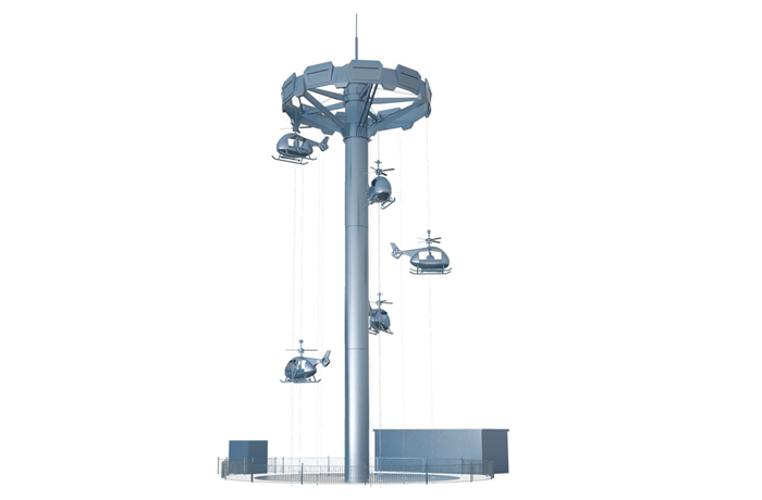 以中國?助研制直-5直升機(jī)為設(shè)計(jì)靈感,模仿直升機(jī)運(yùn)??式制作的?款游樂設(shè)備。直升機(jī)的座艙外形,配備軍裝迷彩的配?;打破傳統(tǒng)新穎的背靠背的乘坐?式,觀景視野更開闊。運(yùn)?時(shí),乘客猶如在直升機(jī)中,時(shí)?升?頂端,時(shí)?上下起伏,頂上和尾翼的旋翼會(huì)隨上升下降?配合轉(zhuǎn)動(dòng)。