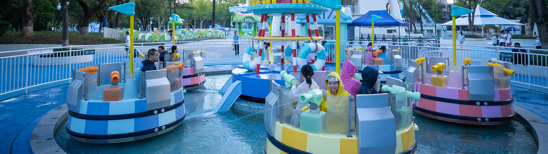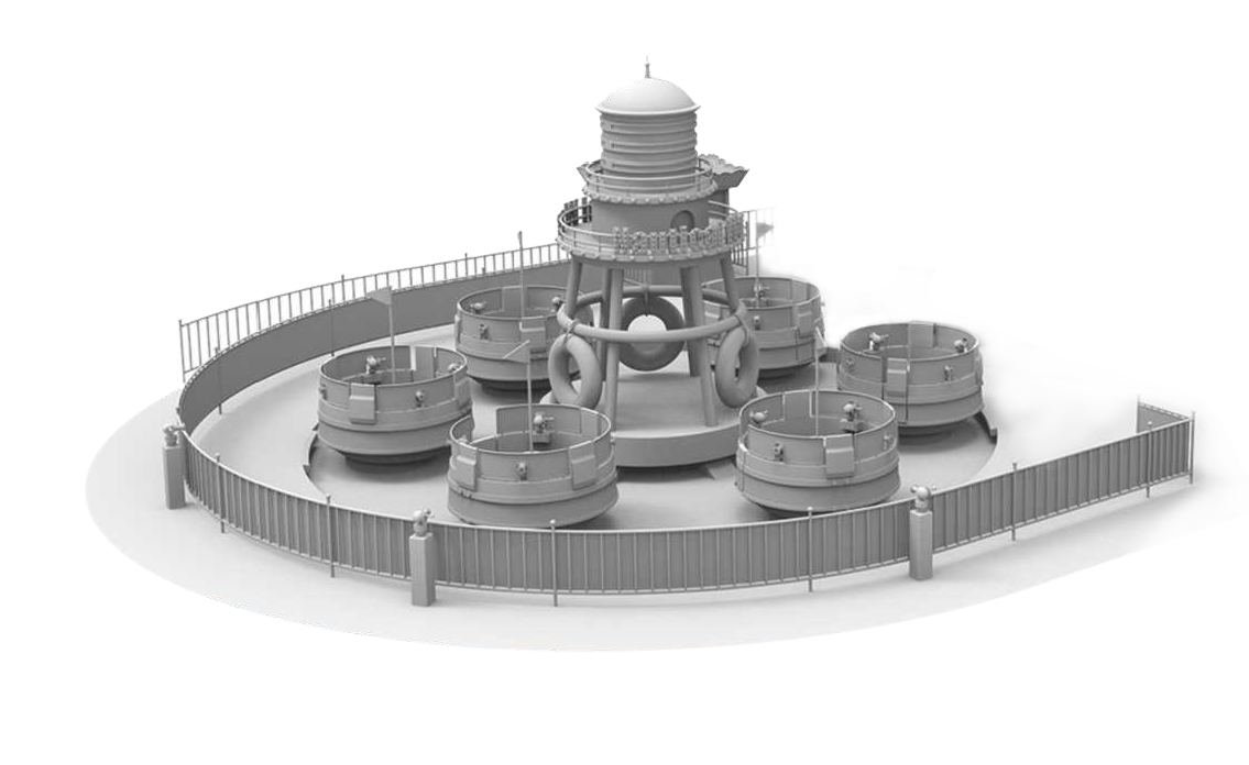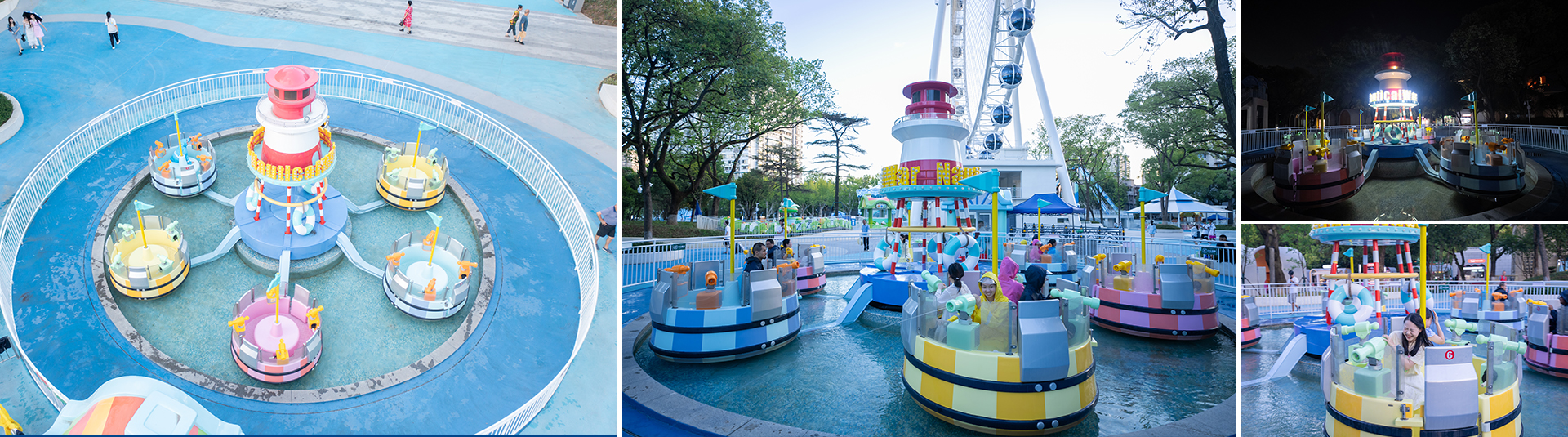 航海?戰(zhàn)是以海洋?戰(zhàn)為主題的轉(zhuǎn)?類親?設(shè)備。巧妙利?中?燈塔回轉(zhuǎn)?撐連接轉(zhuǎn)臂帶動艙體公轉(zhuǎn),同時圍繞艙體??中?軸線順時針和逆時針交替旋轉(zhuǎn);每個船艙設(shè)有4個?槍,各船之間可參與海戰(zhàn)與“?槍?”互相射擊,使在巨浪旋轉(zhuǎn)中的親?海戰(zhàn)更加激烈有趣。